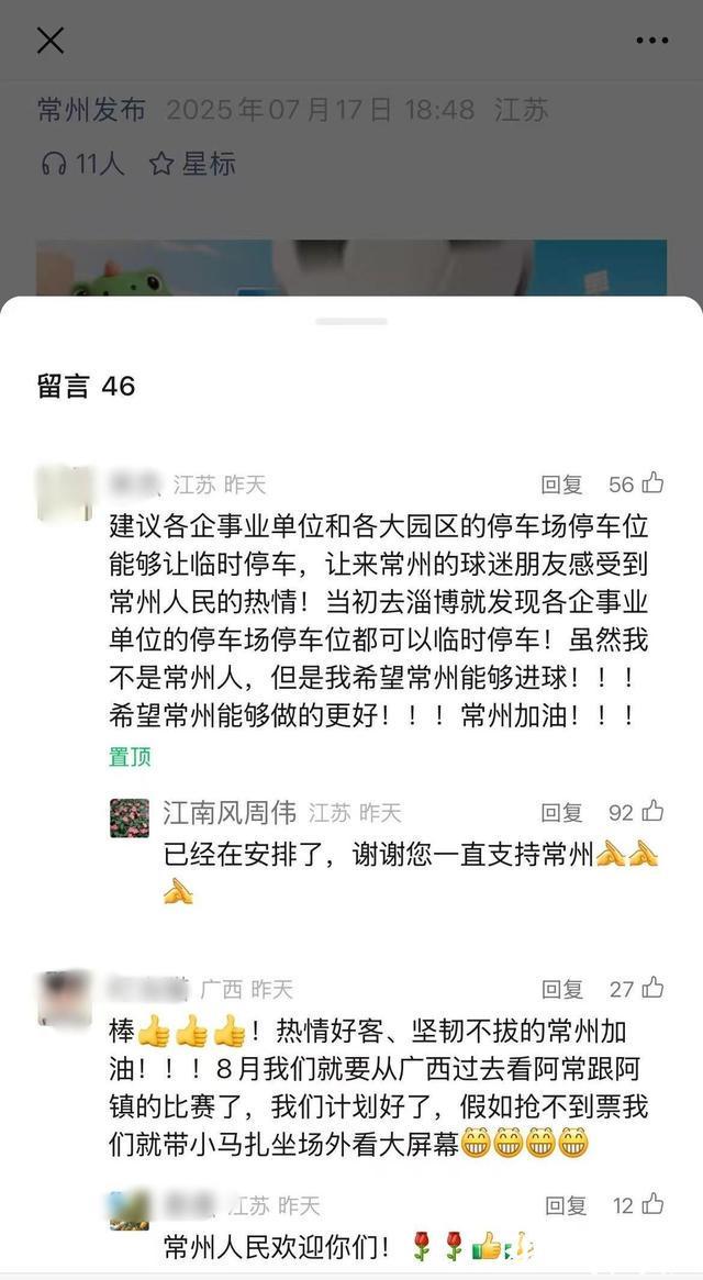 此前,7月17日,在常州队主场迎战徐州队之前,周伟就曾在“常州发布”留言区回复网友的建议,安排观赛停车事宜,被众多网友点赞。在此基础上,为听取市民和网友的建议,7月22日,“常宝许愿池”正式面向全国球迷和游客开放。“许愿池”的开放,为全国球迷和游客搭建起一个与常州畅所欲言对话的平台,截至目前,“常宝许愿池”已收到近15万条留言建议。